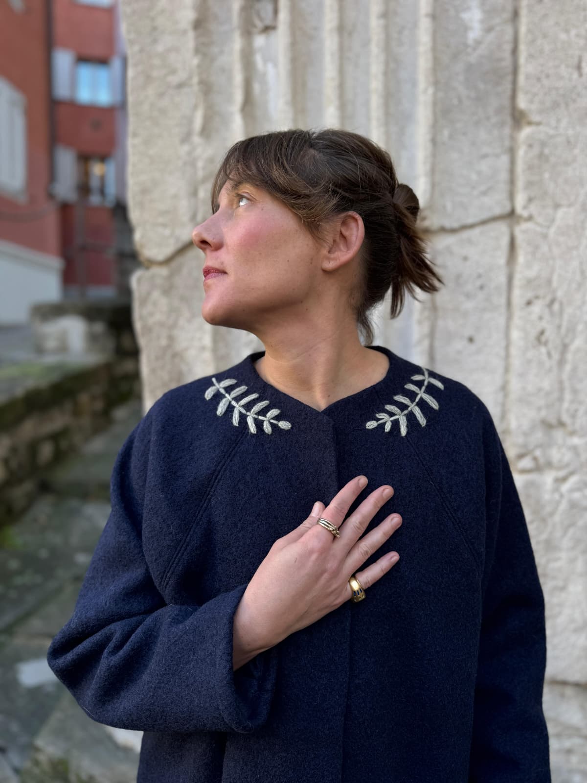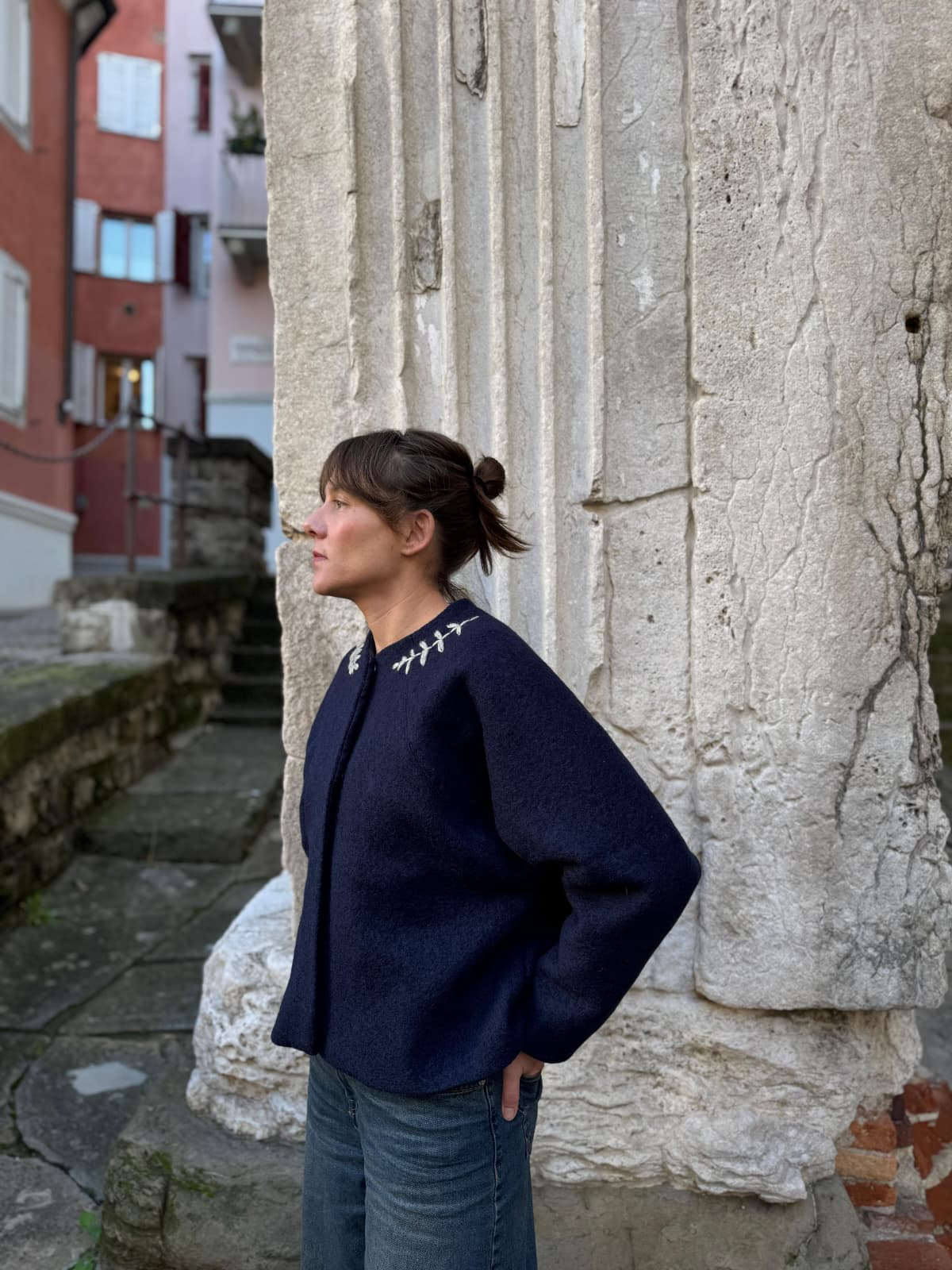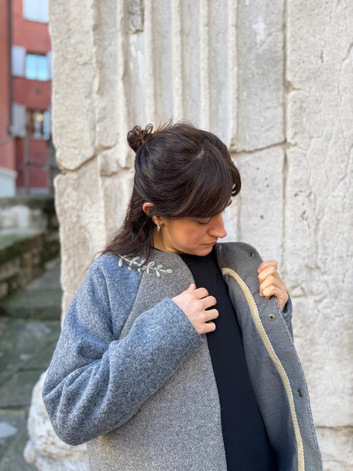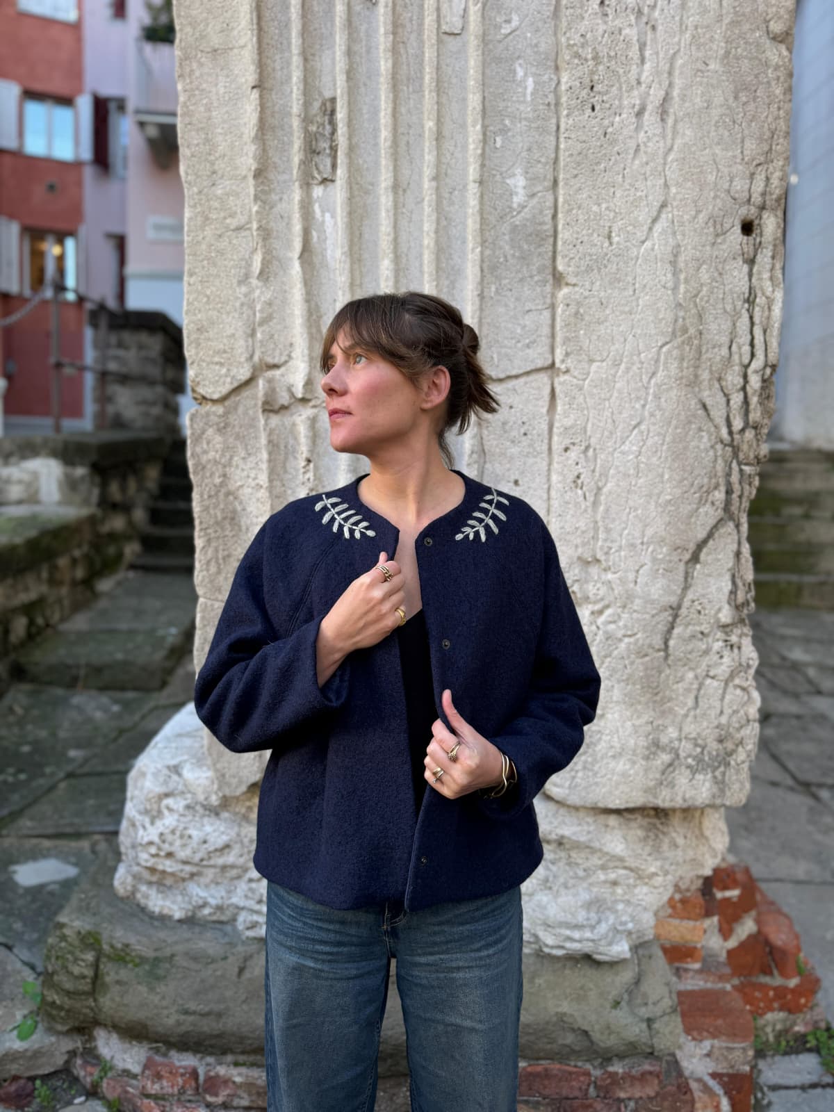 Giacca in lana ricamata a mano. Foderata in flanella di cotone.